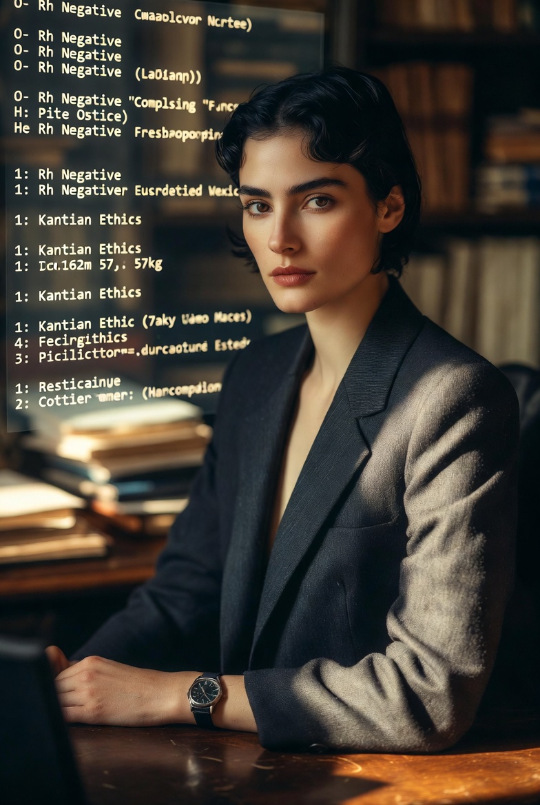 A photorealistic, 8k cinematic portrait of a 27-year-old woman, exactly 1.62m tall and 57kg. Her physical structure is lean, healthy, and poised. She has a distinctive facial structure that is mostly European (75% Caucasian/Euro-Mexican) with subtle Indigenous Mexican features (25% Latina), creating a sophisticated “castiza” look. Her naturally deep black hair is cut into an elegant Lob (Long Bob), an intermediate length that is straight and versatile, with a sophisticated sheen, framing her jawline without complexity. Her eyes are dark, direct, serious, and analyzing, reflecting a strong, structural Capricorn personality. She is dressed in an impeccable but well-worn charcoal grey tailored wool pantsuit (reflecting “upper-middle class, fallen-on-hard-times”). She is seated with poise at a dark wooden desk in a quiet, organized corporate archive or private library. A single, classic analog wristwatch is on her left wrist. The lighting is low-key, professional, moody, like a late-afternoon sun filtering through an old window, highlighting textures of her skin and the structured Lob haircut. A soft holographic display is visible in the background showing complex ethical compliance code and text like “O- Rh Negative” and “Kantian Ethics”. Style: Fotorrealista, candid professional photograph, precise focus, shallow depth of field, 8k.