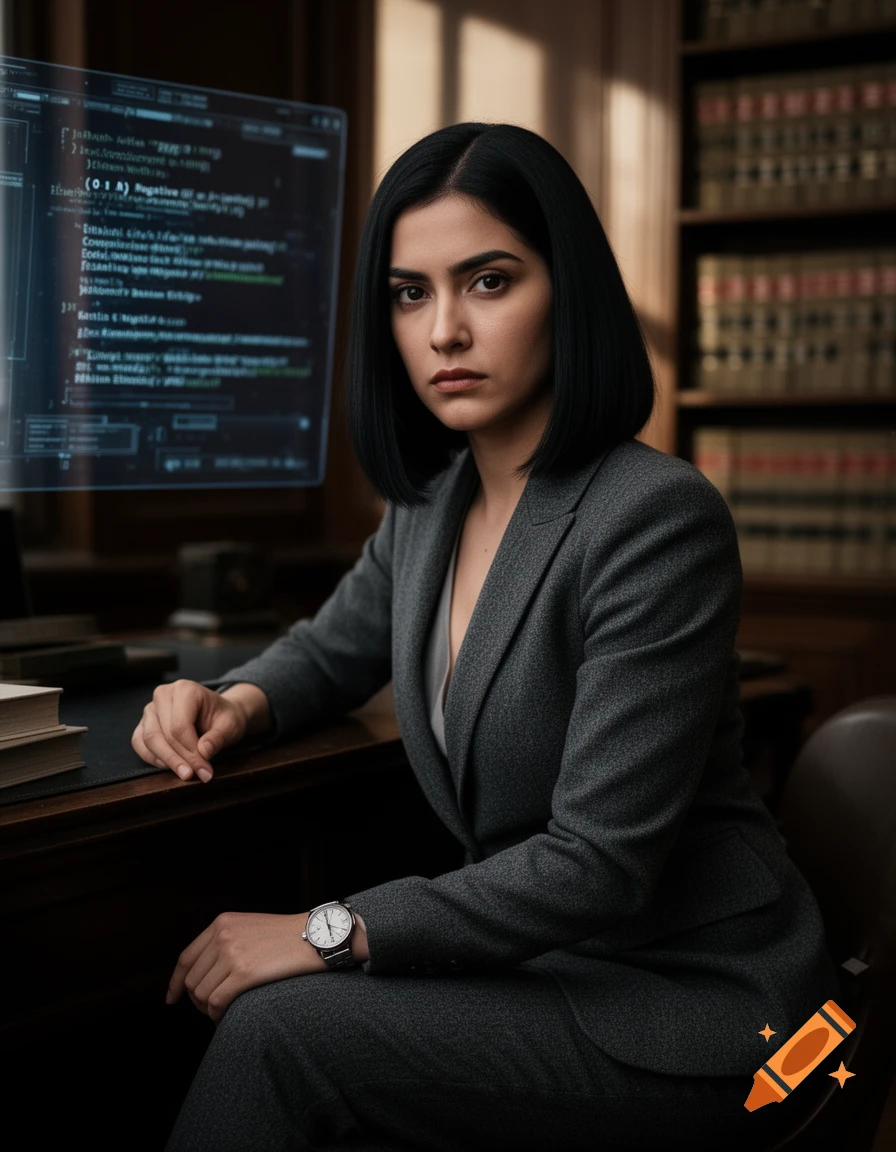 A photorealistic, 8k cinematic portrait of a 27-year-old woman, exactly 1.62m tall and 57kg. Her physical structure is lean, healthy, and poised. She has a distinctive facial structure that is mostly European (75% Caucasian/Euro-Mexican) with subtle Indigenous Mexican features (25% Latina), creating a sophisticated “castiza” look. Her eyes are dark, direct, serious, and analyzing, reflecting a strong, structural Capricorn personality. Her naturally deep black hair is cut into a refined Shag Cut (soft layers, movement, style without complexity) that frames her face. She is dressed in a well-fitted, dark charcoal grey tailored pantsuit made of high-quality wool, which is impeccable but appears well-worn (reflecting “upper-middle class, fallen-on-hard-times”). She is seated with poise at a dark wooden desk in a quiet, organized corporate archive or a private library, not a generic office. A single, classic, old-school analog wristwatch is on her left wrist. The lighting is low-key, professional, and slightly moody (like late-afternoon sun filtering through an old window), highlighting textures of her skin, suit, and the soft layers of her shag cut. The background is softly blurred but features shelves filled with old documents and a visible holographic display showing complex ethical compliance code (with lines like “O- Rh Negative” and “Kantian Ethics”). Style: Fotorrealista, candid professional photograph, precise focus, shallow depth of field, 8k.