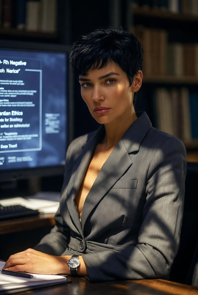 A photorealistic, 8k cinematic portrait of a 27-year-old woman, exactly 1.62m tall and 57kg. Her physical structure is lean, healthy, and poised. She has a distinctive facial structure that is mostly European (75% Caucasian/Euro-Mexican) with subtle Indigenous Mexican features (25% Latina), creating a sophisticated “castiza” look. Her naturally deep black hair is cut into a clean, precise, and modern Pixie Cut, short and structured, framing her face with soft layers that suggest freshness and decisive authority. Her eyes are dark, direct, serious, and analyzing, reflecting a strong, structural Capricorn personality. She is dressed in a impeccable but well-worn charcoal grey tailored wool pantsuit (reflecting “upper-middle class, fallen-on-hard-times”). She is seated with poise at a dark wooden desk in a quiet, organized corporate archive or private library. A single, classic analog wristwatch is on her left wrist. The lighting is low-key, professional, moody, like a late-afternoon sun filtering through an old window, highlighting the texture of her skin and the short Pixie Cut. A soft holographic display is visible in the background showing complex ethical compliance code and text like “O- Rh Negative” and “Kantian Ethics”. Style: Fotorrealista, candid professional photograph, precise focus, shallow depth of field, 8k.