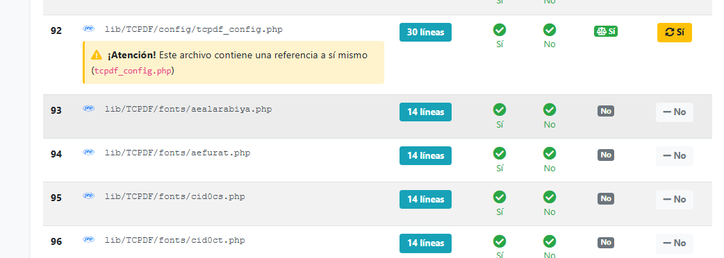 - Hola. Necesito una pantalla de PHP Bootstrap 4.6.2 con Font Awesome 5.15.4 via Jsdeliver de CDN. Lo que quiero que haga es que me muestre de manera recursiva todos los archivos PHP del presente directorio y si existe una llamada directa a sí mismo. Por ejemplo, si el archivo ejemplo.php tiene la cadena ejemplo.php, avisar que es recursivo (esto me interesa por el nombre que no lo puedo cambiar), si es UTF-8, líneas de código, si menciona la palabra Licencia, y si tiene BOM.